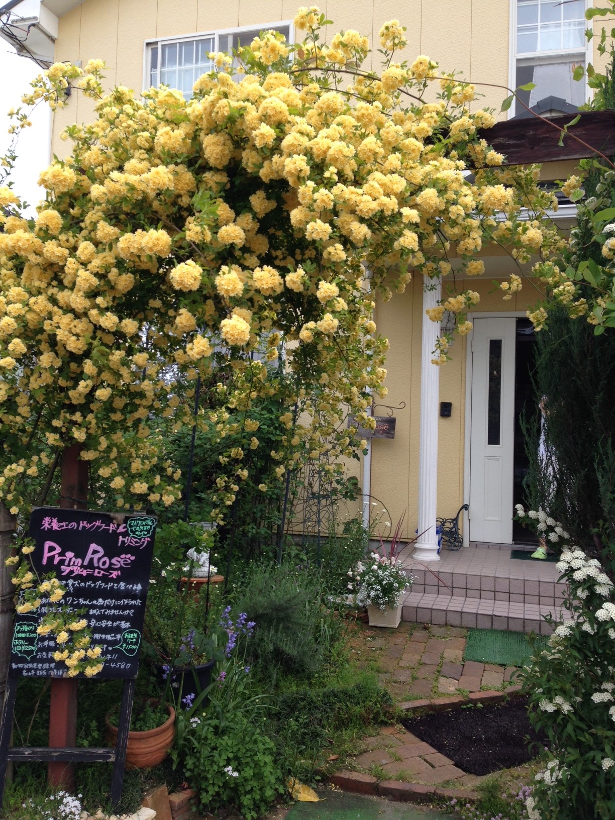 バラのお庭のお店♪ 毎年5月の連休頃にいっぱいの黄色のバラの花が プリムローズの玄関先に満開になります。 |